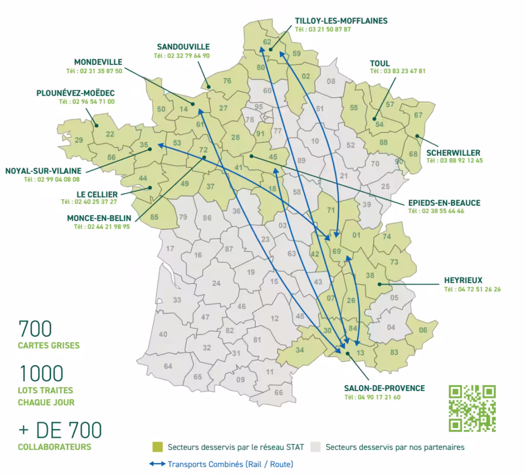 Les 12 agences STAT fonctionnent en réseau intégré permettant de proposer une offre de transport complète au départ et à destination de 43 départements. Grâce à des liaisons quotidiennes entre les agences, vos produits sont livrés en 24 ou 48h sur l’ensemble du territoire.